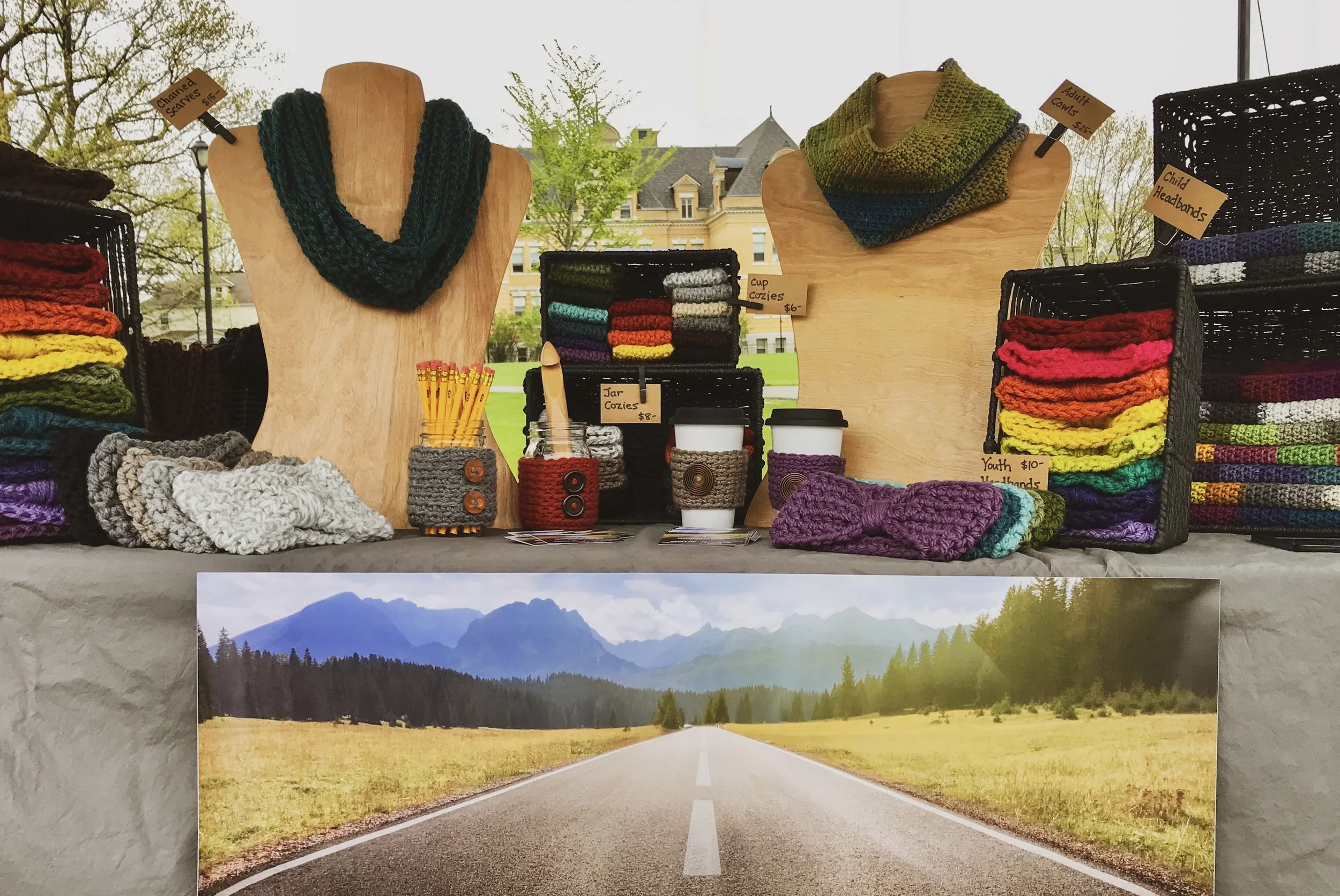 We started our Etsy Shop in early 2018. It was a lengthy learning curve as we spent our first winter exploring how to photograph, market, and package items that we shipped all over the country. That year we attended our local Portland, Maine Farmer’s Market for the first time, setting up a single six-foot table on Saturday mornings to sell our original headbands design. When fall came a few months later, we made scarves and cowls in a variety of colors.